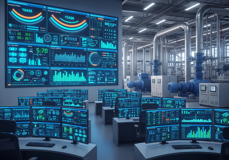 - Utilities: A SCADA system monitors a water distribution network, with PLCs controlling pumps and valves at remote stations.