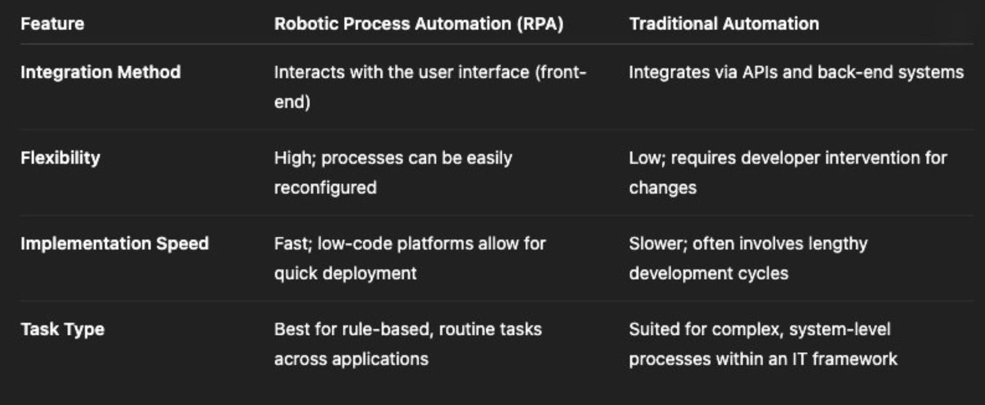 In contrast, RPA works primarily on the front end, interacting with applications through the user interface (UI)—just like a person would. This "surface-level" integration makes RPA faster to implement and more flexible than many older forms of automation. Let's explore these differences further.